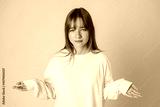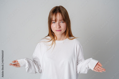A young girl wearing a white long-sleeve shirt expressing confusion in a minimalistic gray studio setting