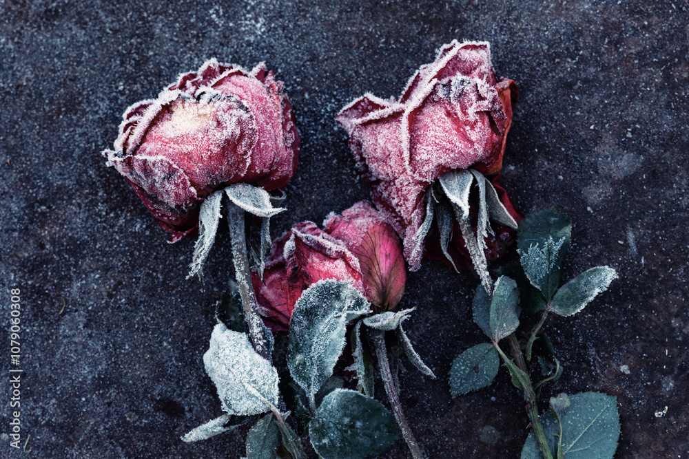 Red roses covered with frost. Close-up of frozen red, pink roses on dark background.