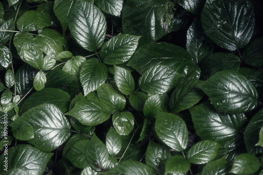 Fresh green wet leaves after rain. Natural beautiful background of wet green leaves. Banner leaf texture.