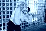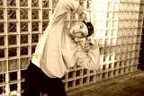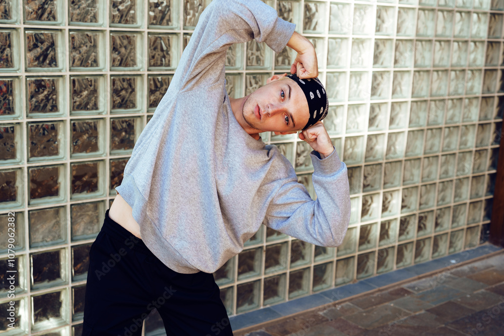 A young man wearing a gray sweatshirt and black pants poses against a wall of glass blocks
