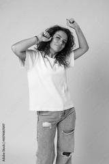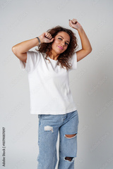 Young woman joyfully celebrates in casual attire against a neutral background