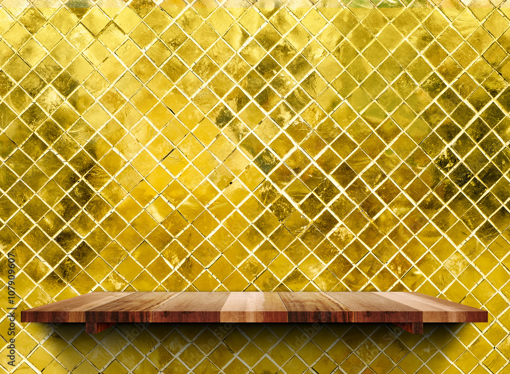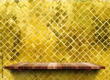 Empty wooden shelfs on glossy mosaic gold tile wall, Mock up tem