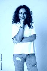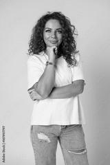 Woman with curly hair thoughtfully pondering in a neutral setting