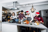 Mexican family cooking turkey meat for Christmas dinner at home in Mexico Latin America, hispanic people with teenagers daughter, son, mother and father in holidays