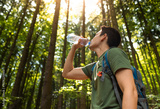 Active man drinking bottle of water while hiking through the forest