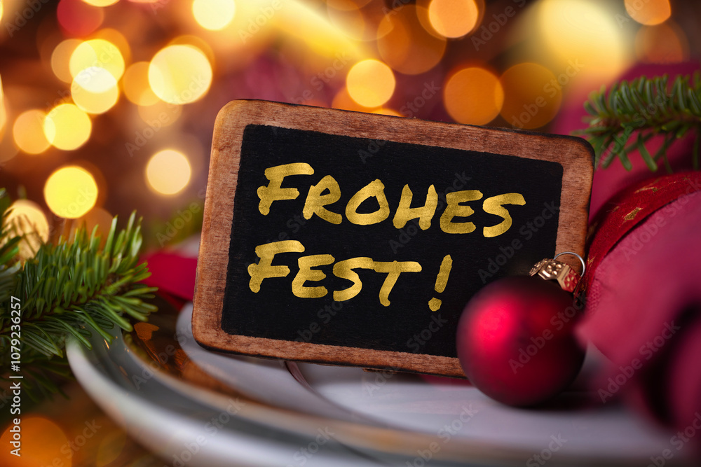 Happy Holidays Greeting Card - Sign on a festively decorated Christmas Party dinner table - German text Frohes Fest - Bokeh lights in the background