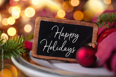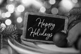 Happy Holidays sign on a festively decorated Christmas table - Bokeh lights in the background