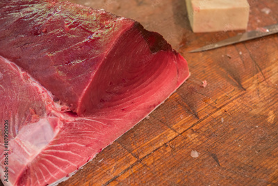 Tuna raw sliced fish store at Tsukiji sea food market, Japan