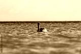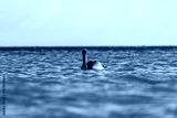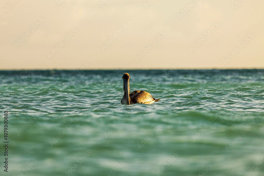 Solitary pelican floating on calm Caribbean Sea with soft evening sunlight on Aruba.