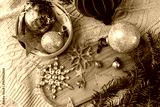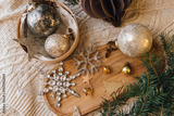 Stylish Christmas baubles flat lay in wooden box on knitted blanket with fir branches and ornaments. Decorating christmas tree with authentic vintage golden baubles. Xmas background