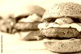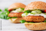 Big sandwich - hamburger with juicy chicken burger, cheese, cucumber, chili and tartar sauce on a light wooden background