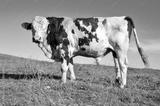 Beautiful and powerful Montbeliarde bull in a cow herd in a pasture.