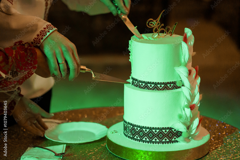 Elegant Three-Tiered Wedding Cake Being Cut in a Romantic Setting
