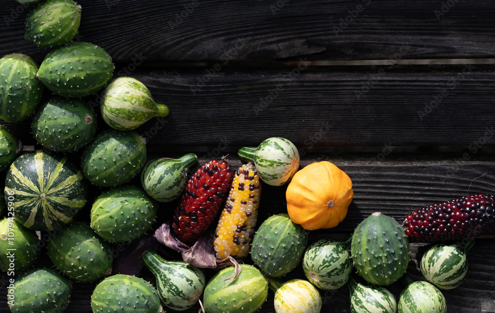 Ornamental pumpkins, colorful ornamental corn and ornamental cucumbers form a frame in front of dark wooden slats. There is space for text