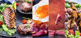 Grill food.Grill meat chicken beef and bacon.Grill sirloin steak,chicken breast - chicken legs.Grill bacon and egg english breakfast.Collage of delicious grilled close-up. Advantageous banners 5 in 1