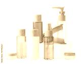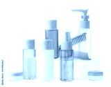 Variety of colorful personal care bottles and grooming accessories arranged on a white surface