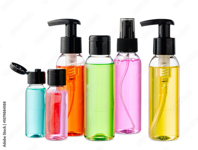 Variety of colorful personal care bottles and grooming accessories arranged on a white surface