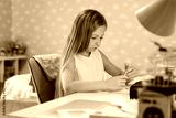 A young girl sits at her desk in her bedroom, focusing intently on a drawing