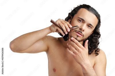 A man with curly hair grooming his beard in a well-lit space while using a straight razor