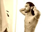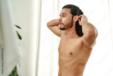 A young man applies skincare cream while looking in a round mirror in a bright bathroom