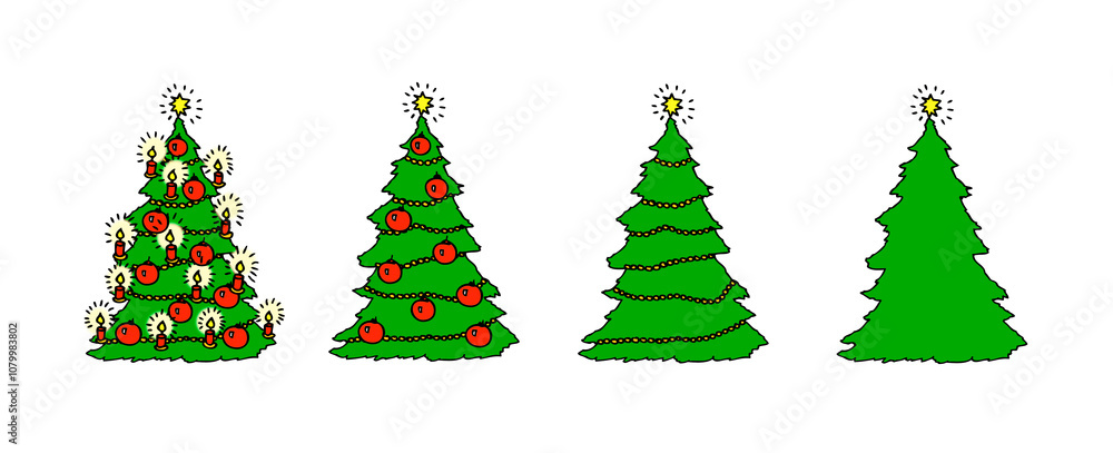Vier ungeschmückte und geschmückte Weihnachtsbäume