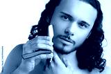 Man with curly hair grooming his beard carefully using a straight razor against a plain white background