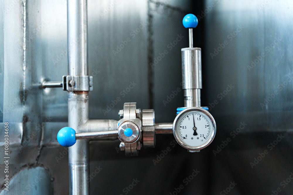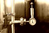 A close-up of a pressure gauge and valve attached to a pipe in a factory setting