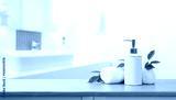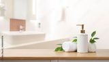 Close-up view of spa accessories on wooden table over blurred bathroom interior background