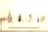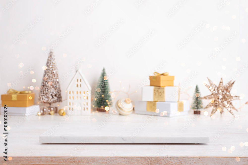 Empty stone podium on wooden table over blurred Christmas holiday decoration objects background