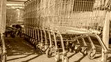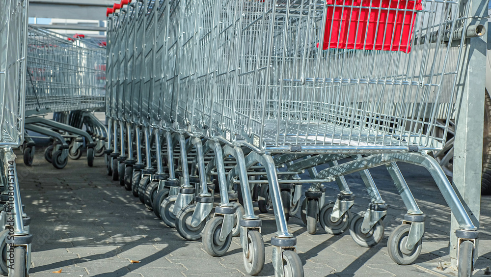 A row of shopping trolleys outside a supermarket shop - metal shopping carts