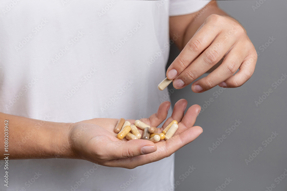 Woman holding in hands beige medical herbal capsules closeup over white shirt