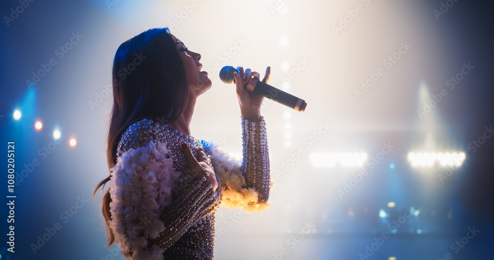 Talent Show Performance: Portrait of a Young Female Pop Singer on a Stage with Colorful Neon Lighting. Musician Singing a Powerful Solo, Poring Her Heartfelt Emotions into Beautiful Music