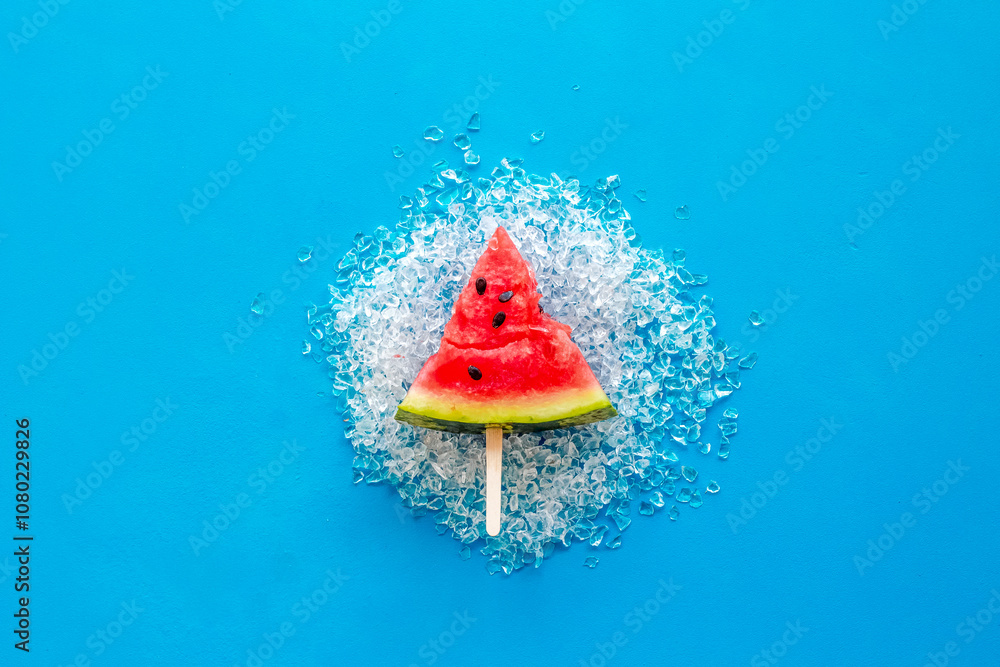 Fresh watermelon on stick with ice for fruit ice cream on blue background top view