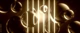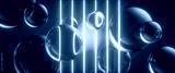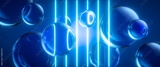 3D render. Abstract blue background of vertical glowing neon lines reflecting in transparent glass balls bubbles and spheres with reflections and refractions. Futuristic technology wallpaper