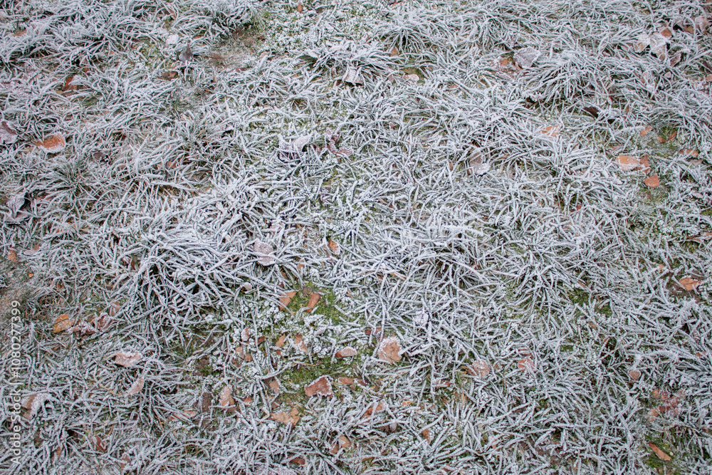 Frosted plants during a frosty morning, winter.