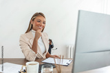Business woman, office and laptop at desk with online working, planning and creative work. Writer, thinking and ideas for article with reading and journalist employee at content creation agency.