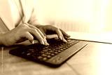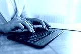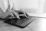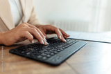Keyboard, hands and businesswoman in the office typing for legal research for a court case. Technology, career and closeup of professional female attorney working on a law project in modern workplace.