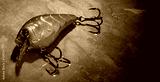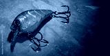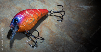 Bright orange fishing lure with two treble hooks sitting on a wet rock