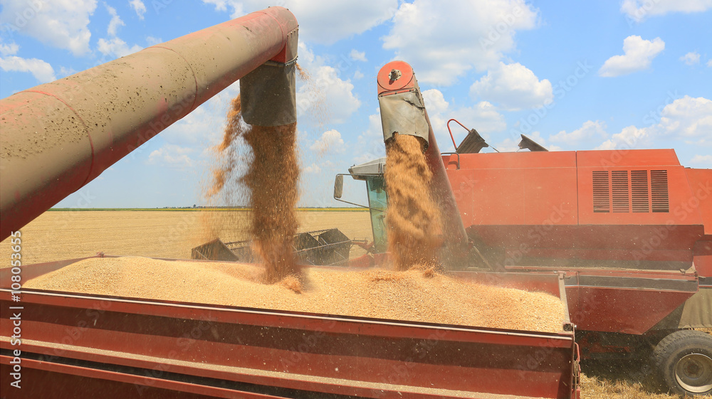 Combine harvesters transferring freshly harvested wheat to tractor-trailer for transport