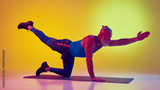 Elderly man with fit muscular body training on fitness mat, doing exercises against gradient yellow background in neon light. Concept of sport, active elderly lifestyle, health care