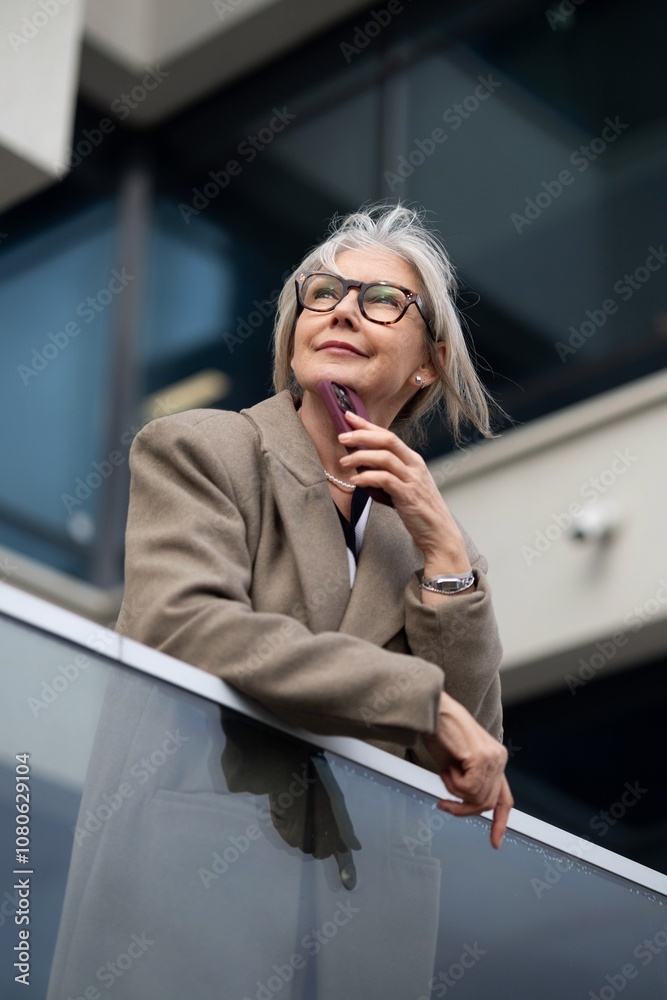 Elderly businesswoman thoughtfully gazing into the distance while standing on a modern balcony in an urban setting