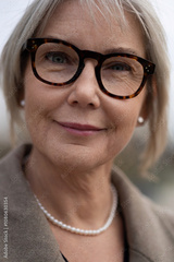 Elderly businesswoman stands confidently outside her office on a bright day in the city, showcasing her professional style and demeanor