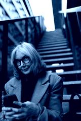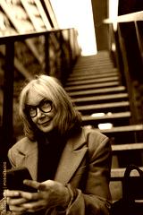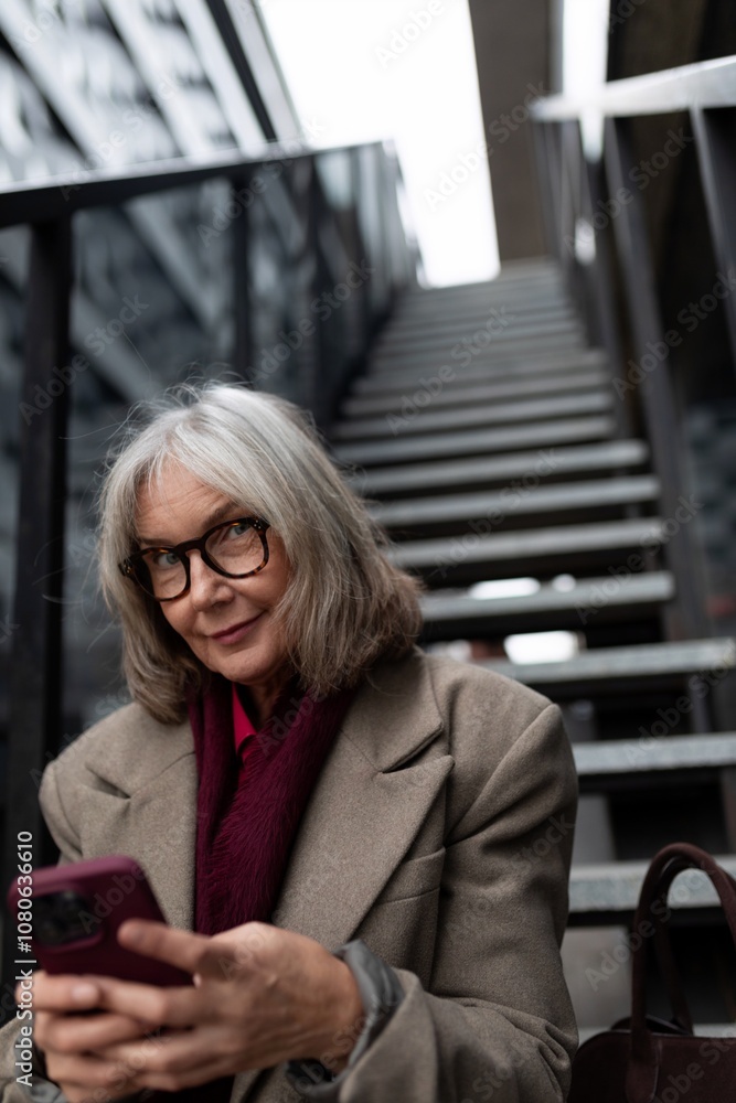 Elderly businesswoman sitting on office steps while using her mobile phone on a cloudy day in the city