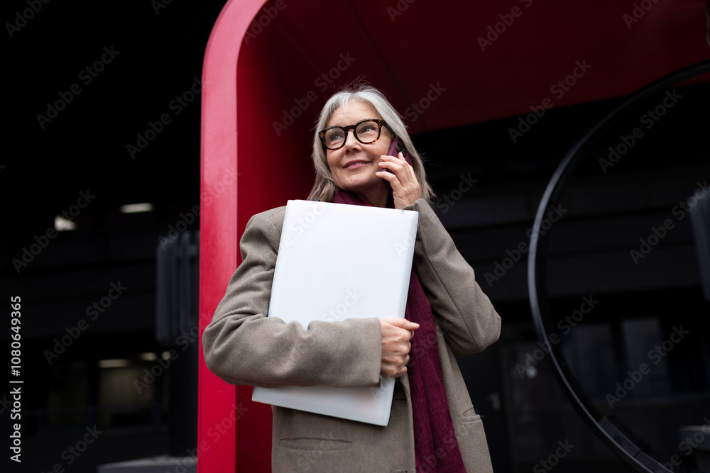 Elderly businesswoman standing outside her office, speaking on the phone while holding a laptop