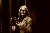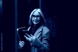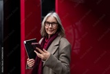 Elderly businesswoman stands confidently outside her office while checking her phone, dressed in a stylish coat and scarf