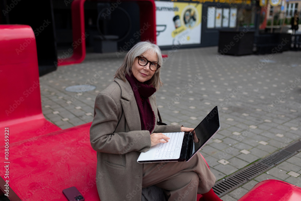 Senior businesswoman working on laptop outside in urban setting during the day