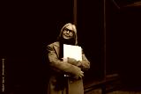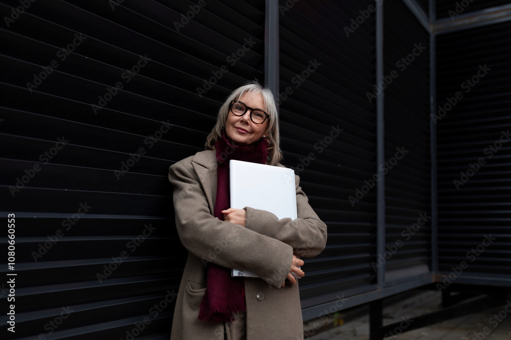 Senior businesswoman confidently standing outside, holding a portfolio and dressed casually in a trench coat during overcast weather