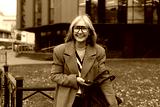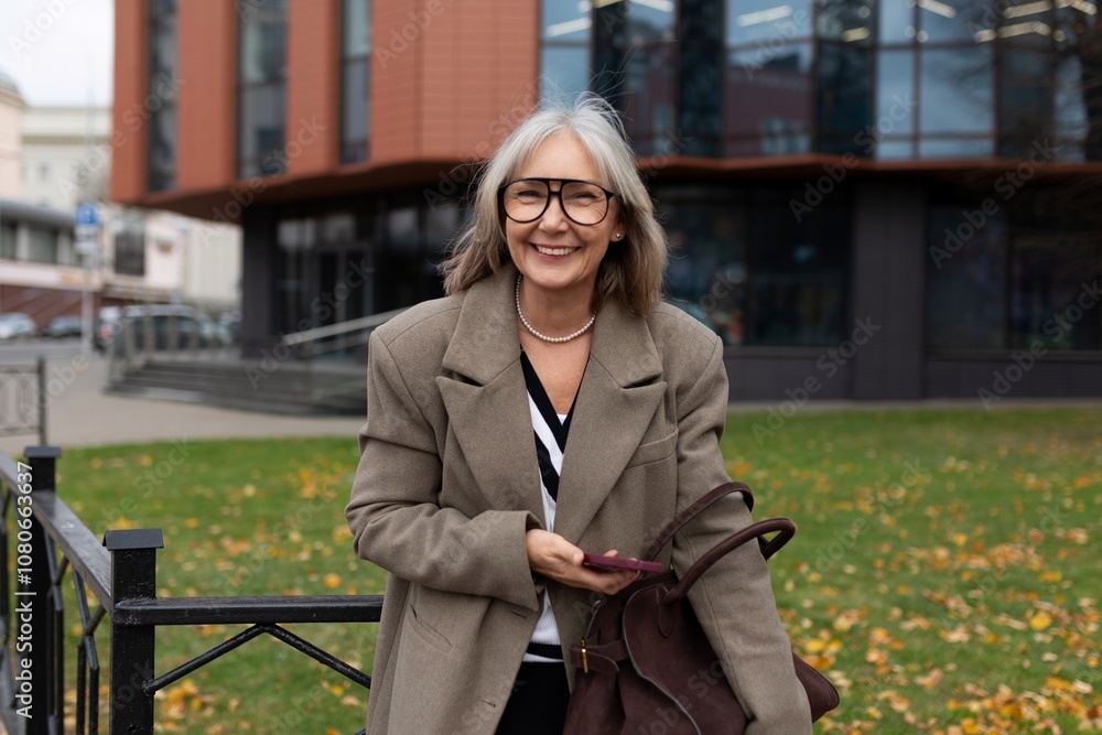 An older businesswoman smiles warmly while holding her phone and bag in front of a modern office building on a chilly autumn day