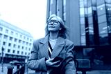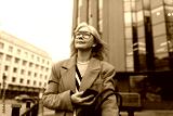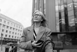 A middle-aged businesswoman confidently walks outside a modern office building while looking at her smartphone on a cloudy day