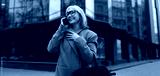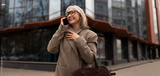 Elderly businesswoman in stylish coat smiles while talking on her mobile phone outside a modern building in the city during daylight